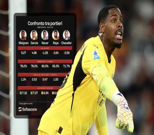 25/26赛季,米兰一门迈尼昂状态明显复苏,多次在关键比赛中力挽狂澜。据专业机构统计,法国国门的实际失球数要比预期失球数少9.27个,该项数据排名欧洲五大联赛第1位。好消息是,米兰即将以队内顶薪与其续约至2031年。