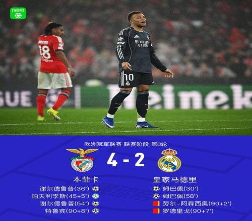 北京时间1月29日欧洲冠军联赛 联赛阶段 第8轮,本菲卡对阵皇家马德里。上半场,姆巴佩破门。谢尔德鲁普扳平比分,楚阿梅尼送点,帕夫利季斯主罚命中。下半场,帕夫利季斯助攻,谢尔德鲁普再下一城。随后,姆巴佩扳回一城。读秒阶段,门将特鲁宾破门。全场比赛结束,皇马2-4不敌本菲卡,银河战舰进入附加赛,而本菲卡则凭借最后进球以第24名进入附加赛。