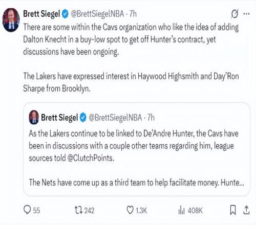 在Brett Siegel的报道中,湖人队有意在交易截止日得到的球员还不止亨特一人,篮网队的海史密斯、夏普也是意中人。