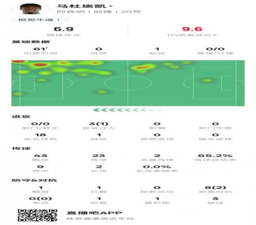 体育播报2月1日宣 英超第24轮,阿森纳客战利兹联,马杜埃凯首发出战,送出1次助攻,2次关键传球,1次过人成功,评分6.9。