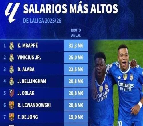 德转列西甲球员年薪榜:姆巴佩3130万欧居首,皇马包揽前四